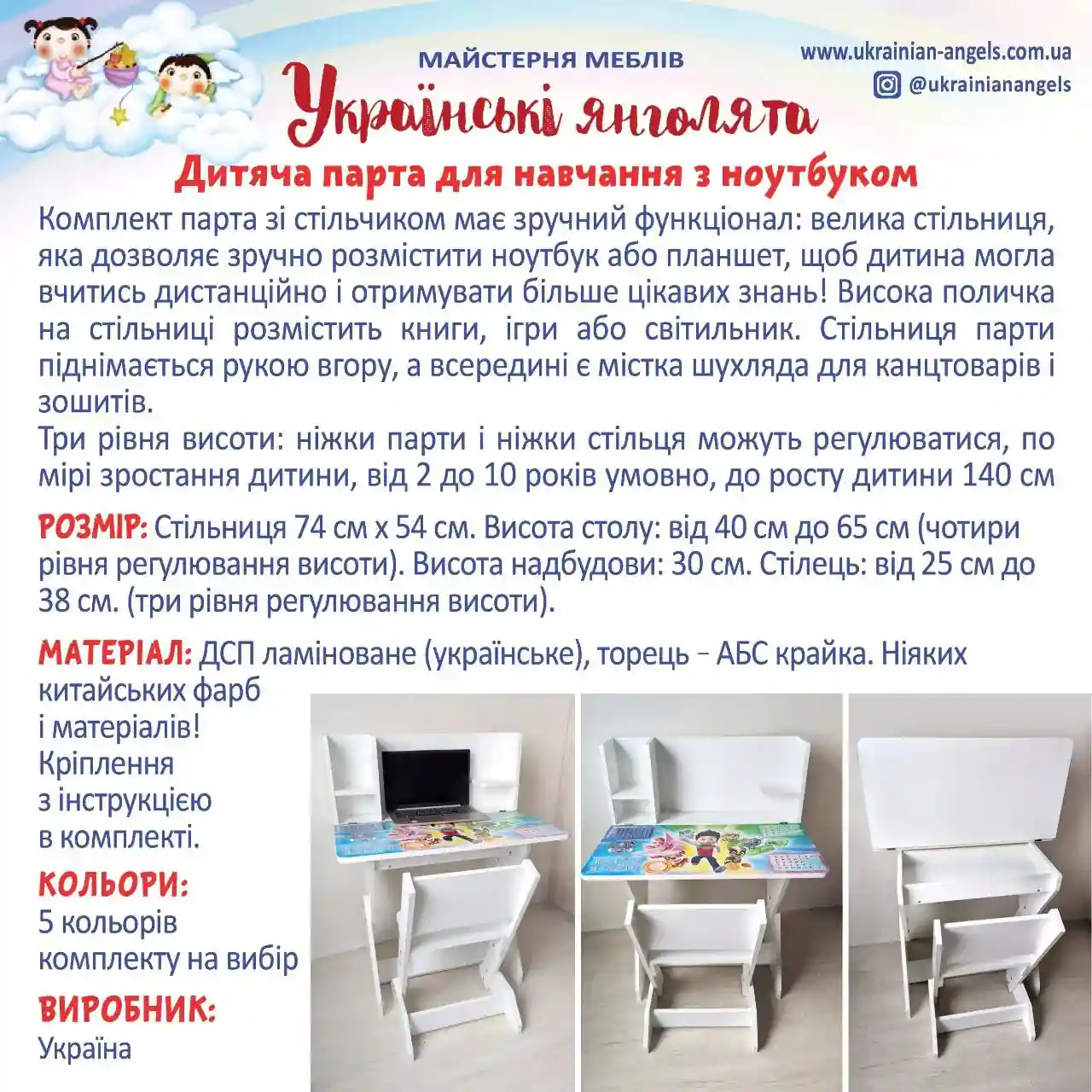 Комплект дитячий парта зі стільчиком має зручний функціонал: велика стільниця, яка дозволяє зручно розмістити ноутбук або планшет, щоб дитина могла вчитись дистанційно і отримувати більше цікавих знань!