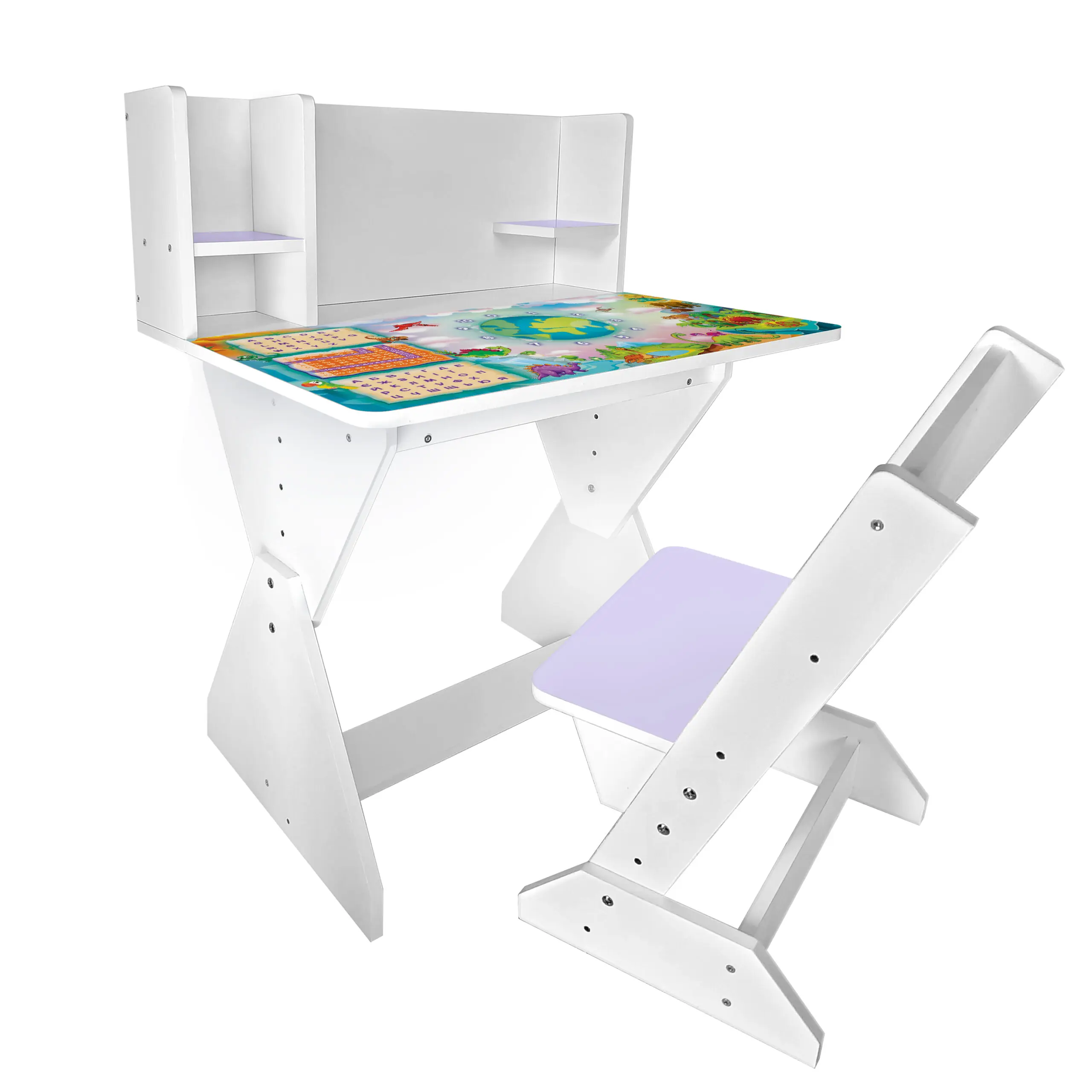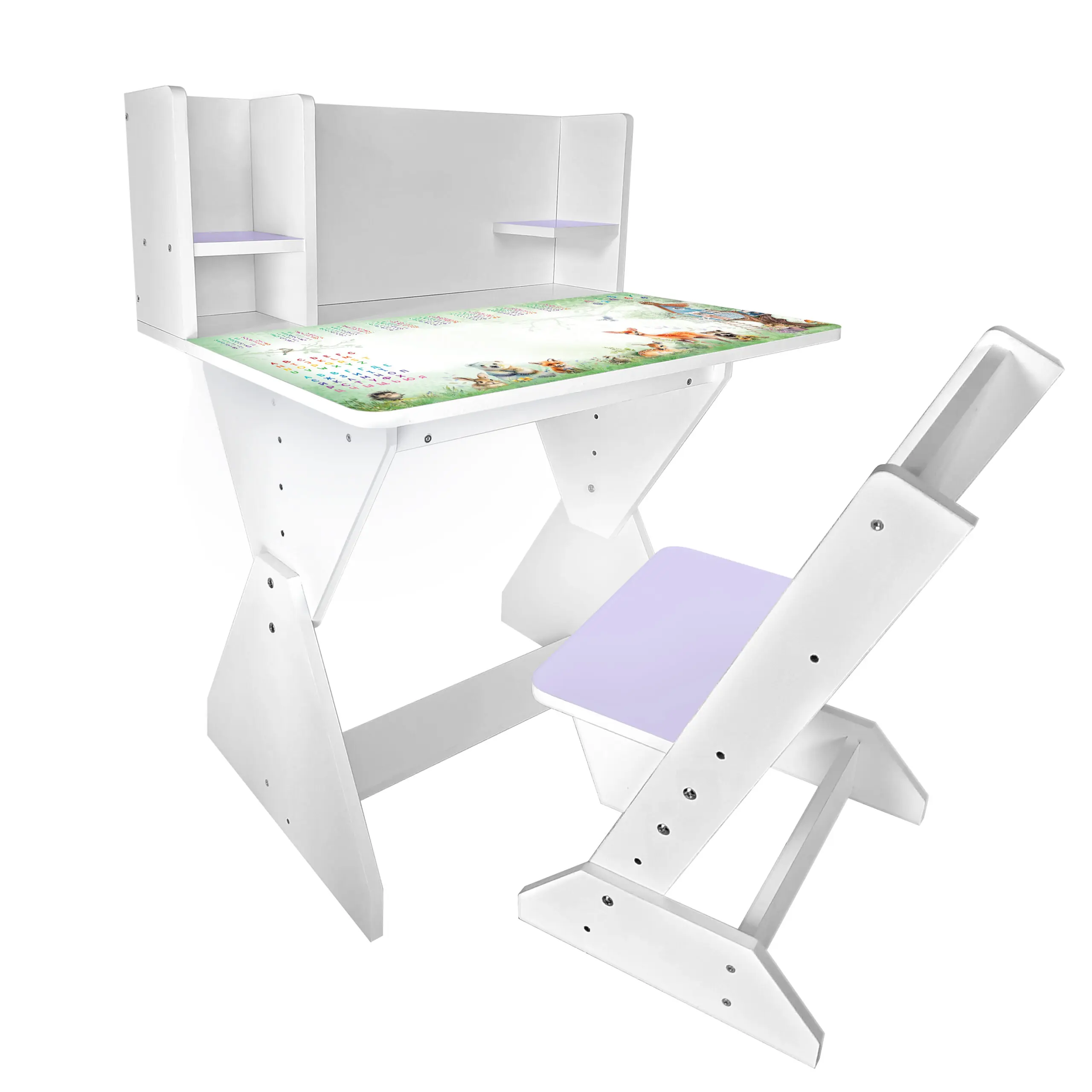 Три рівня висоти: ніжки парти і ніжки стільця можуть регулюватися, по мірі зростання дитини, від 2 до 10 років, до 5 класу.