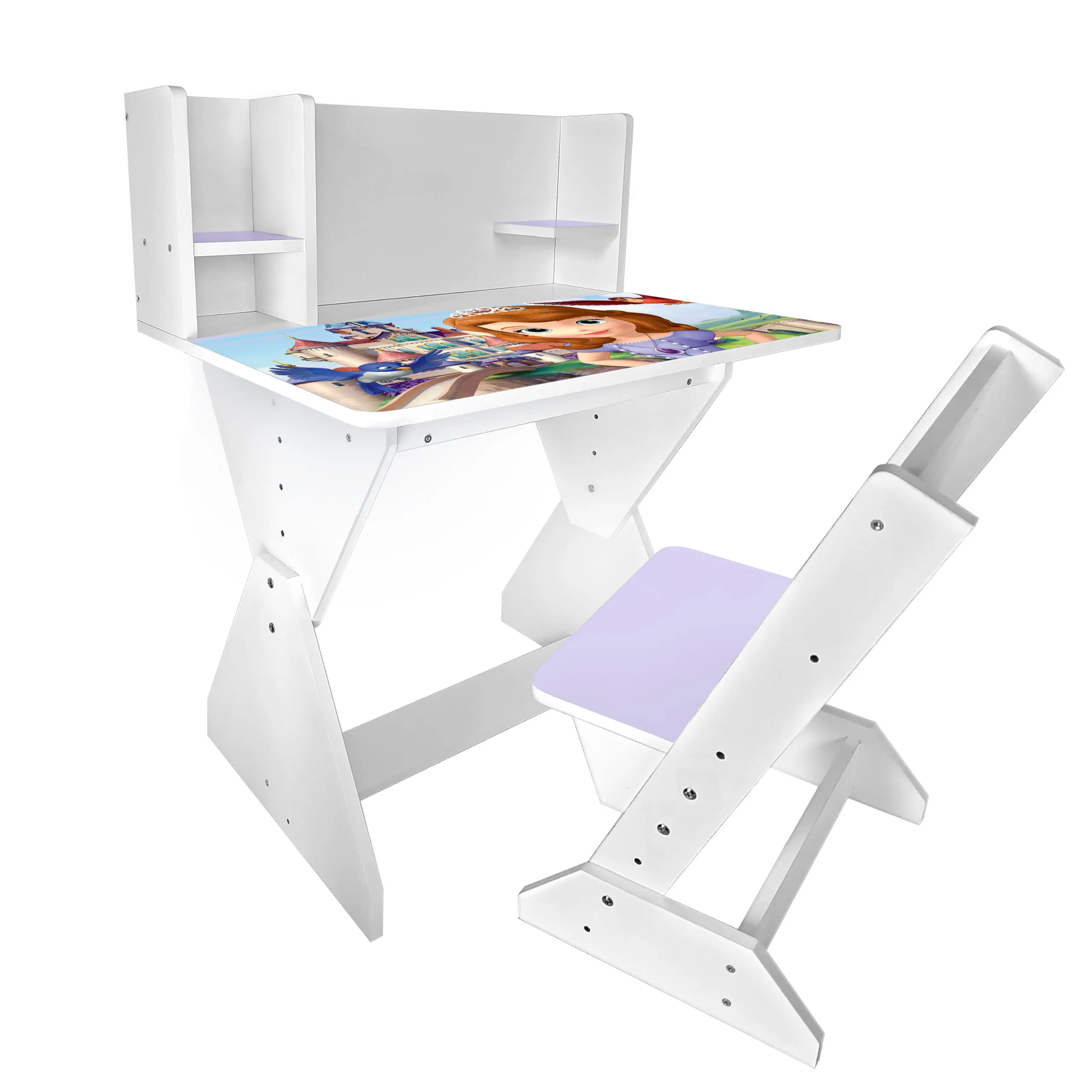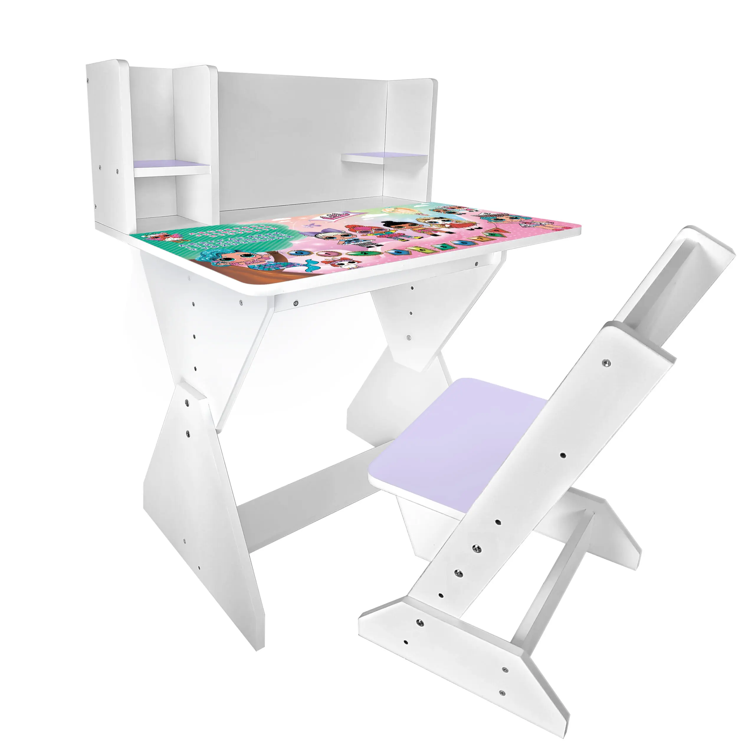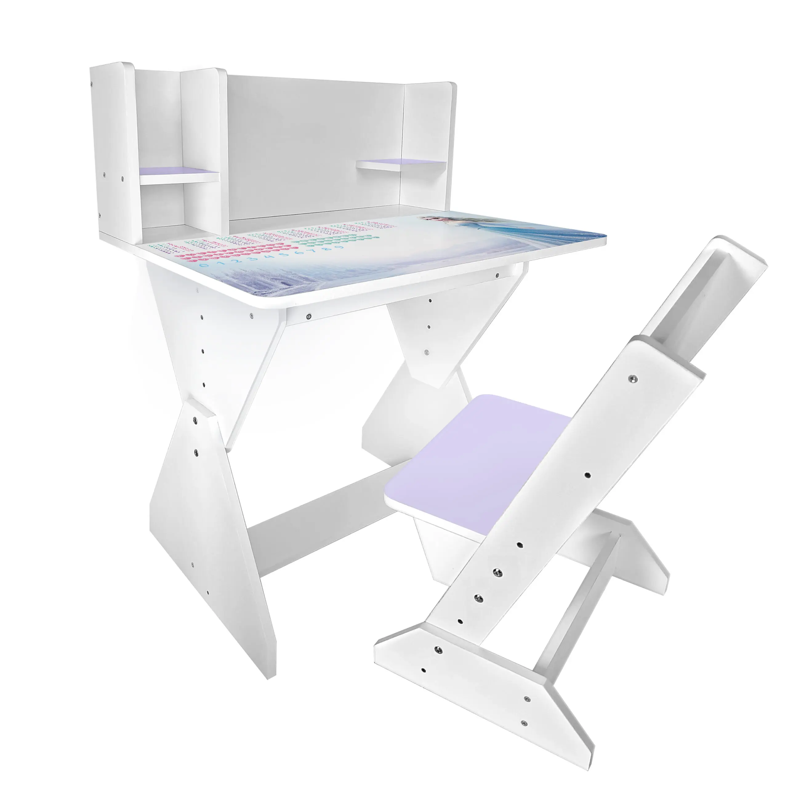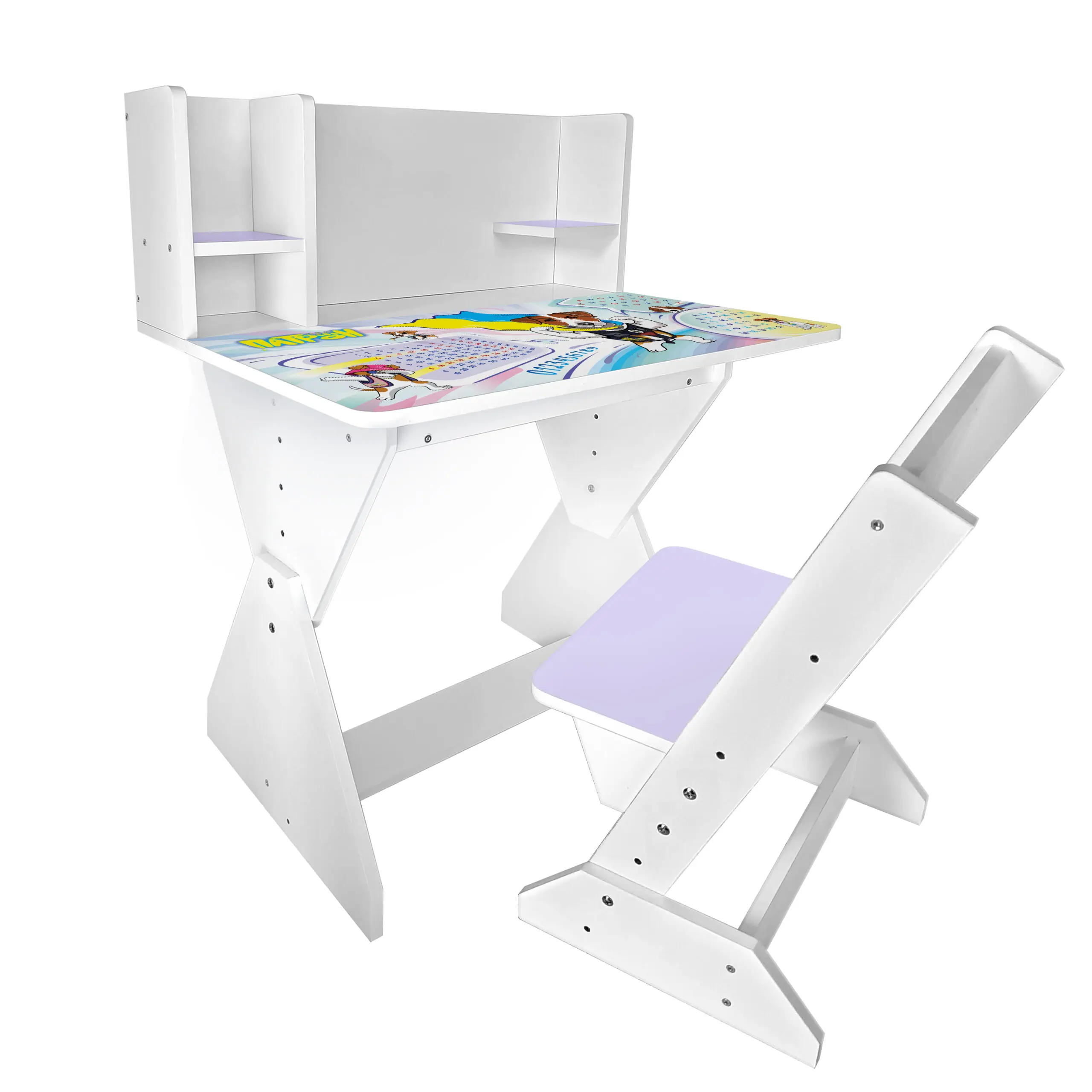 Колір: біло-лавандовий (стільчик має лавандову спинку і сідушку, та перегородки на парті).